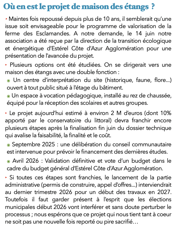 Ils seront affinés et sans doute complétés au fil du temps. Les JMZH en février 2026 avec un chantier nature et un jeu découverte pour les familles. L’accompagnement des scolaires sur le site. Un rendez-vous est déjà prévu avec 4 classes de l’école Giono en mars, 1 classe de l’école St François de Paule à Fréjus, et 4 classes de l’école Janin de Roquebrune. La participation à la journée « la nature s’invite au collège Villeneuve » en mai qui devrait être prévue par le collège. La participation à la journée « développement durable au lycée Saint Exupéry de St Raphaël » en mai qui est organisée par l’établissement L’accompagnement de groupes d’adultes sur le site : une première date est fixée en avril avec une association de randonneurs du Pradet. Une sortie kayak en juillet Plusieurs chantiers nature dont les dates ne sont pas encore arrêtées. La participation à des événements nationaux telle que la fête de la Nature ou la fête de la Terre sera envisagée en fonction du calendrier et des disponibilités des bénévoles… Le suivi du projet porté par la communauté d’agglomération destiné à la création d’une maison de la nature à la ferme des Esclamandes.